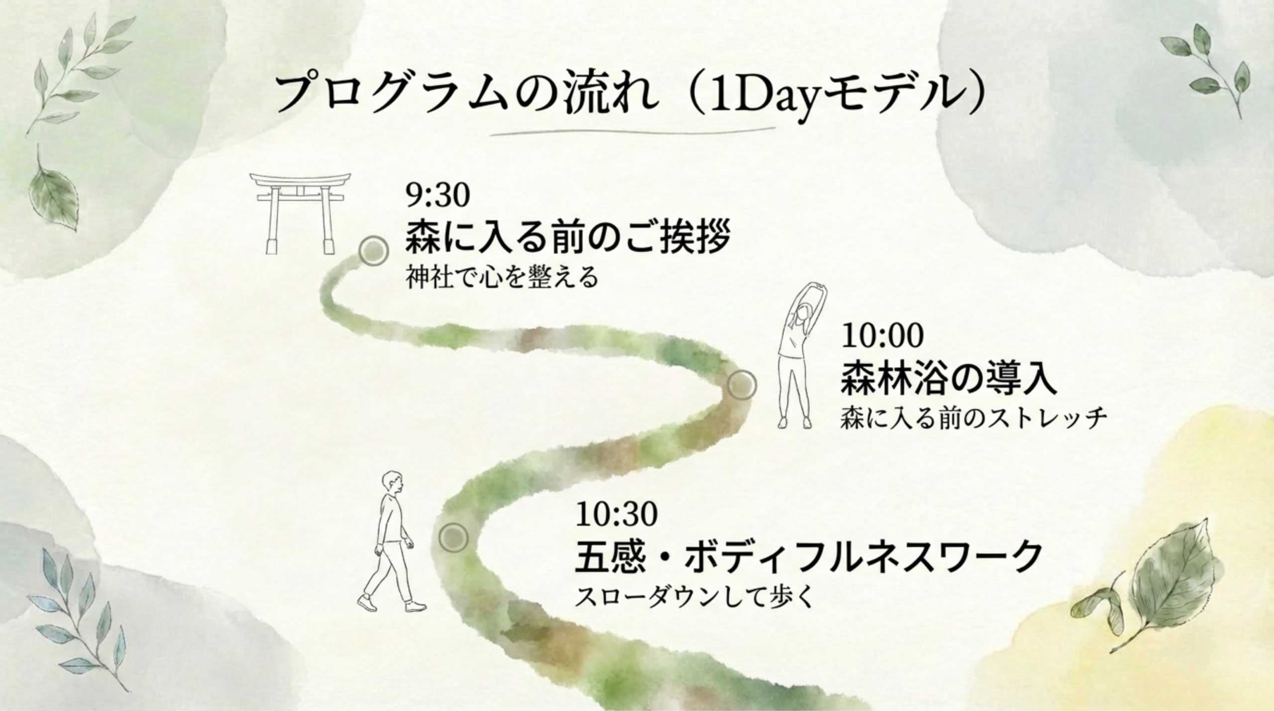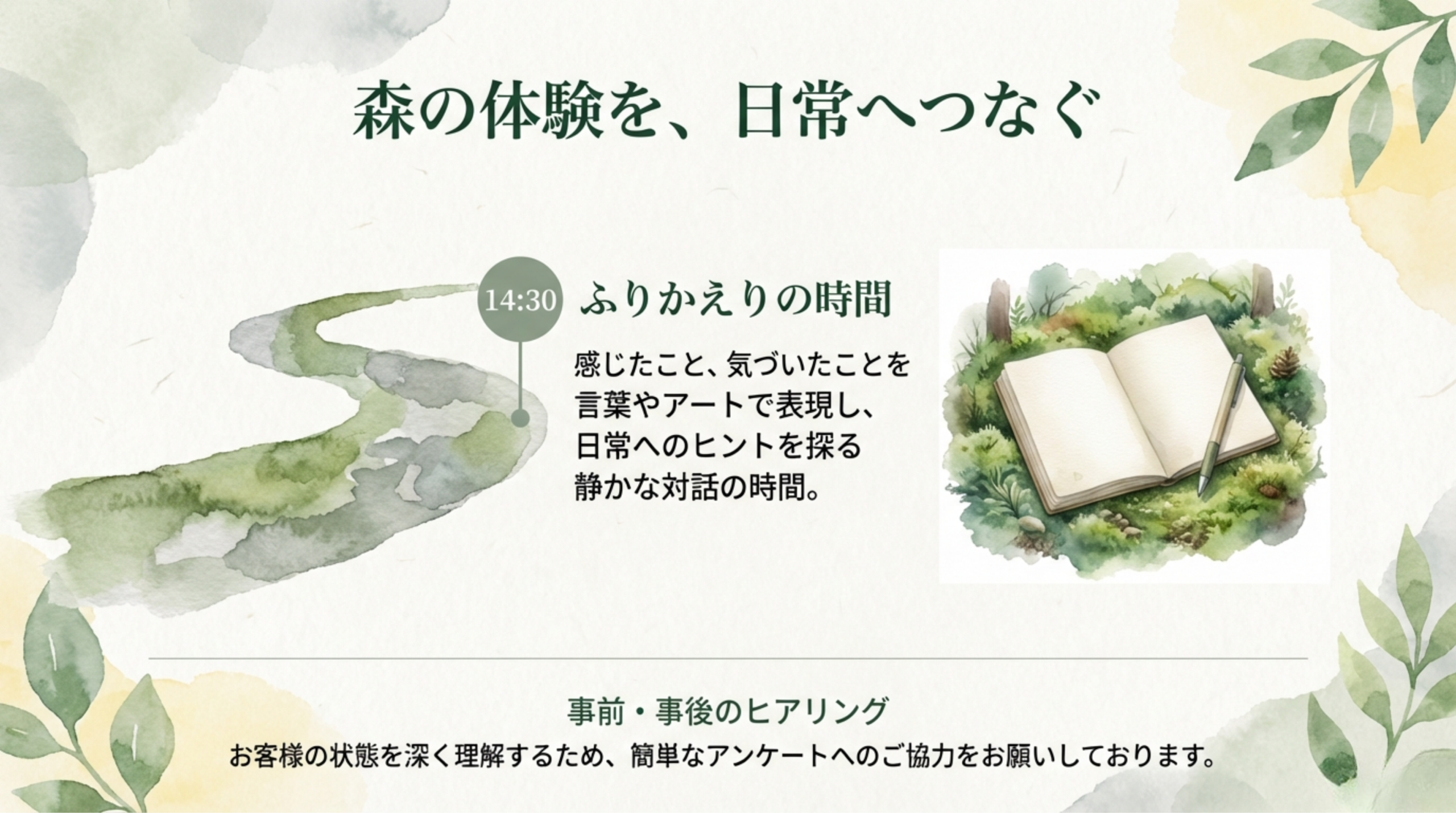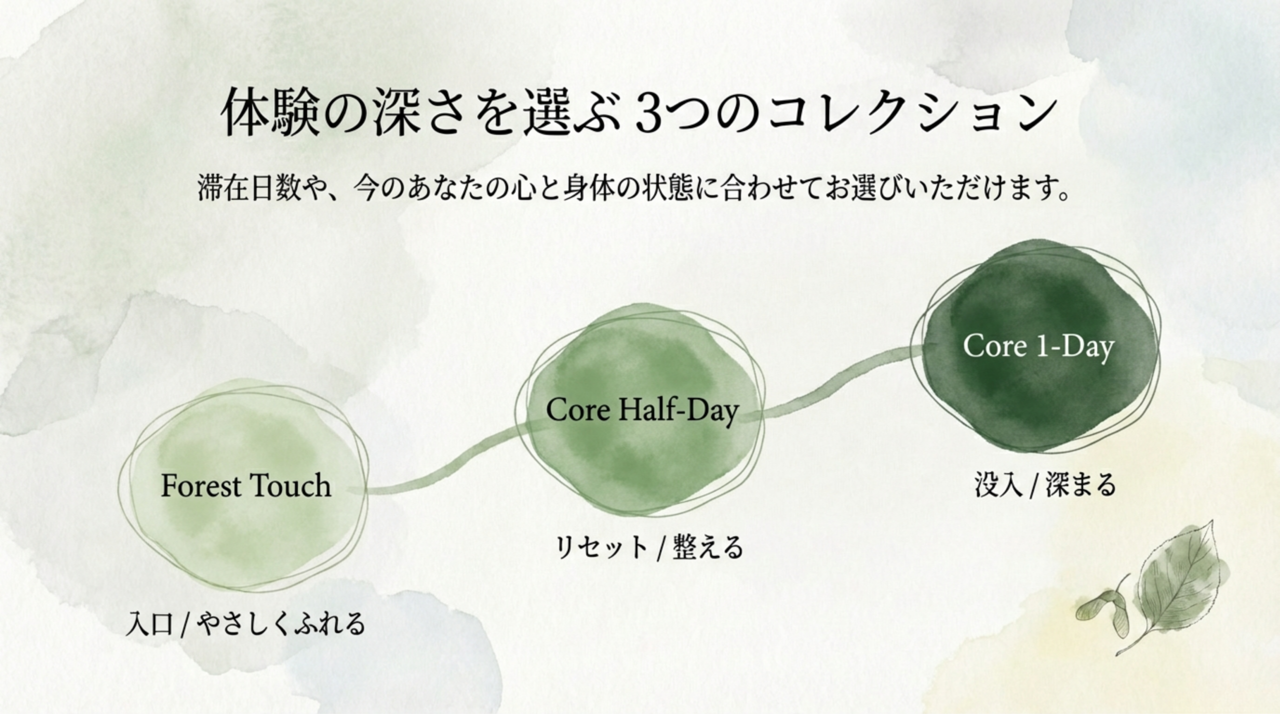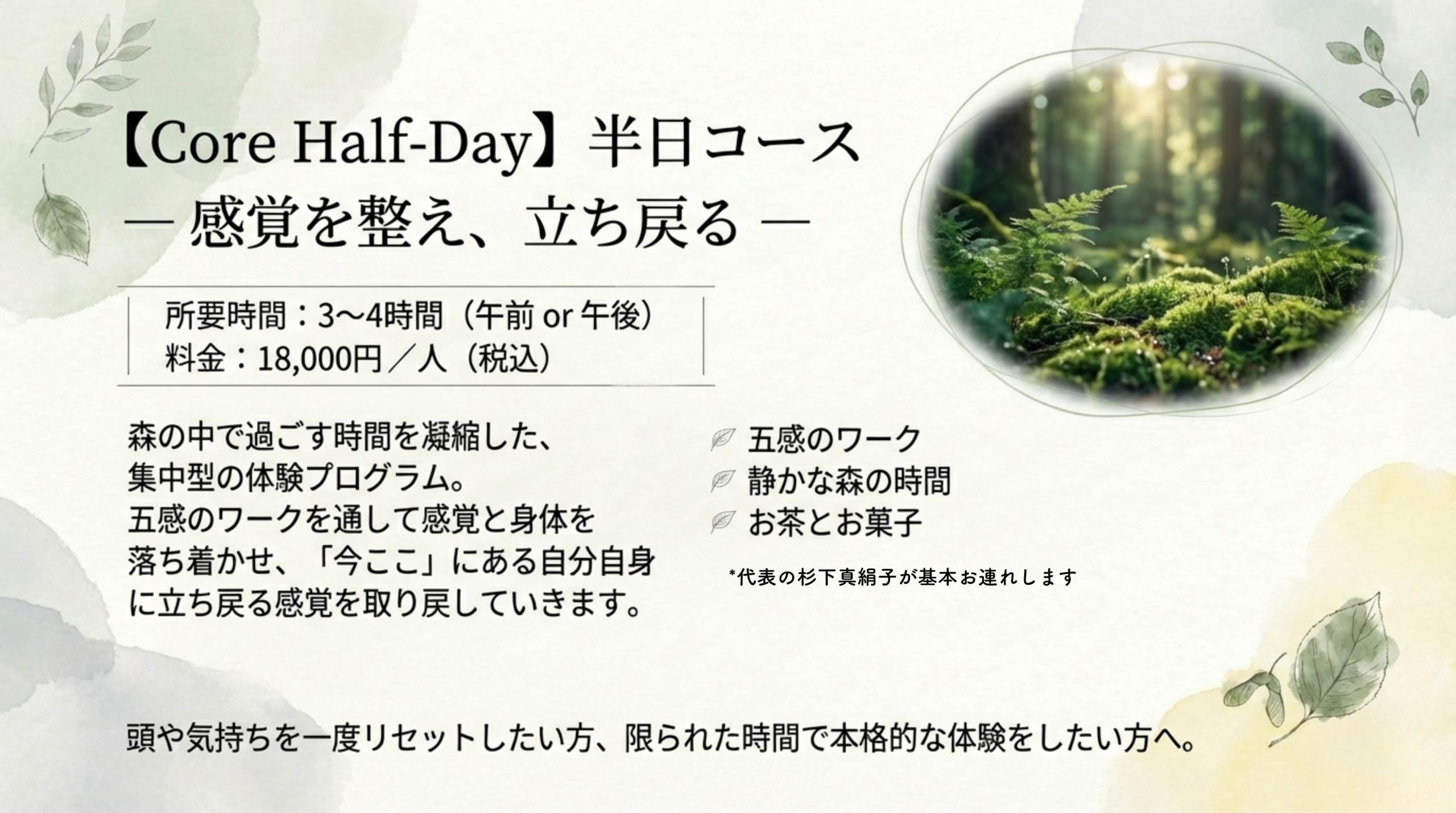 特徴: 集中型の体験で、頭や気持ちを一度リセットし、「今ここ」の自分を取り戻したい方に最適です 。