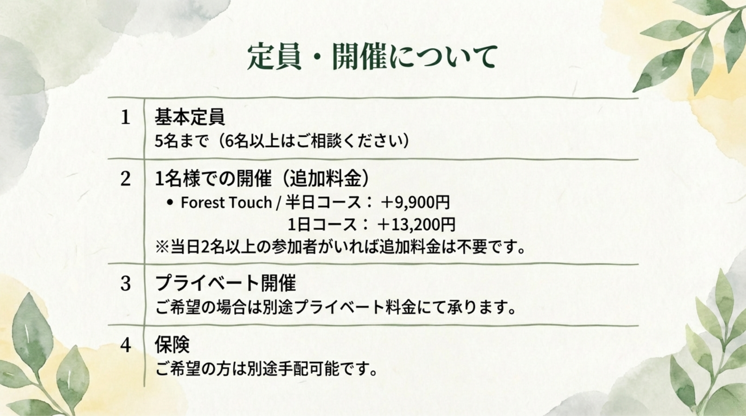 ここに記載している料金は、プログラムの質、内容や時間、そして少人数での実施体制を踏まえた標準的な目安として設定しています。