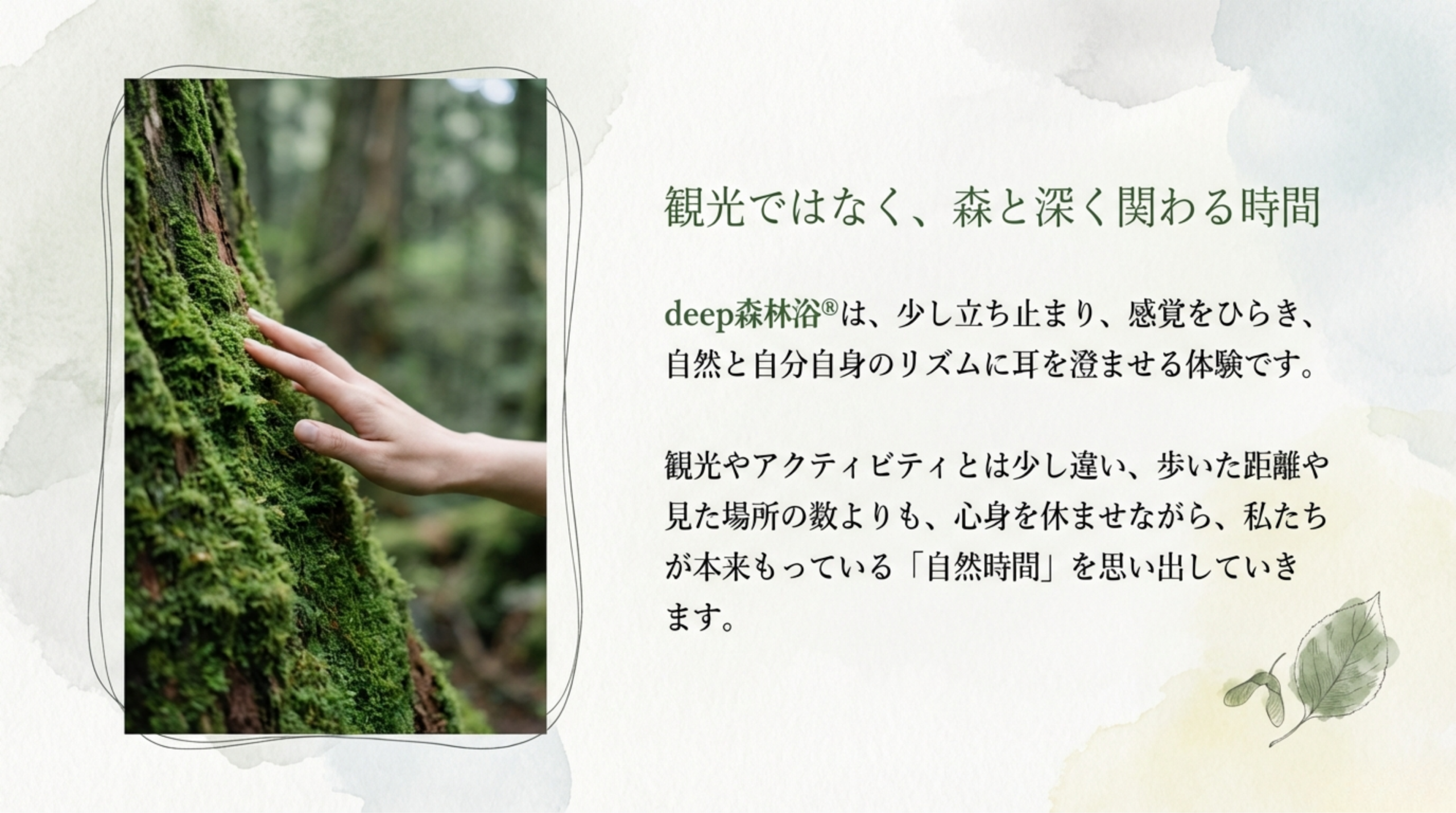 deep森林浴®は、屋久島の深い森で少し立ち止まり、五感をひらいて自分自身のリズムを取り戻す旅です 。歩いた距離や名所を巡ることよりも、今ここにある静けさに身を委ね、本来の「自然時間」を思い出すプロセスを大切にしています 。