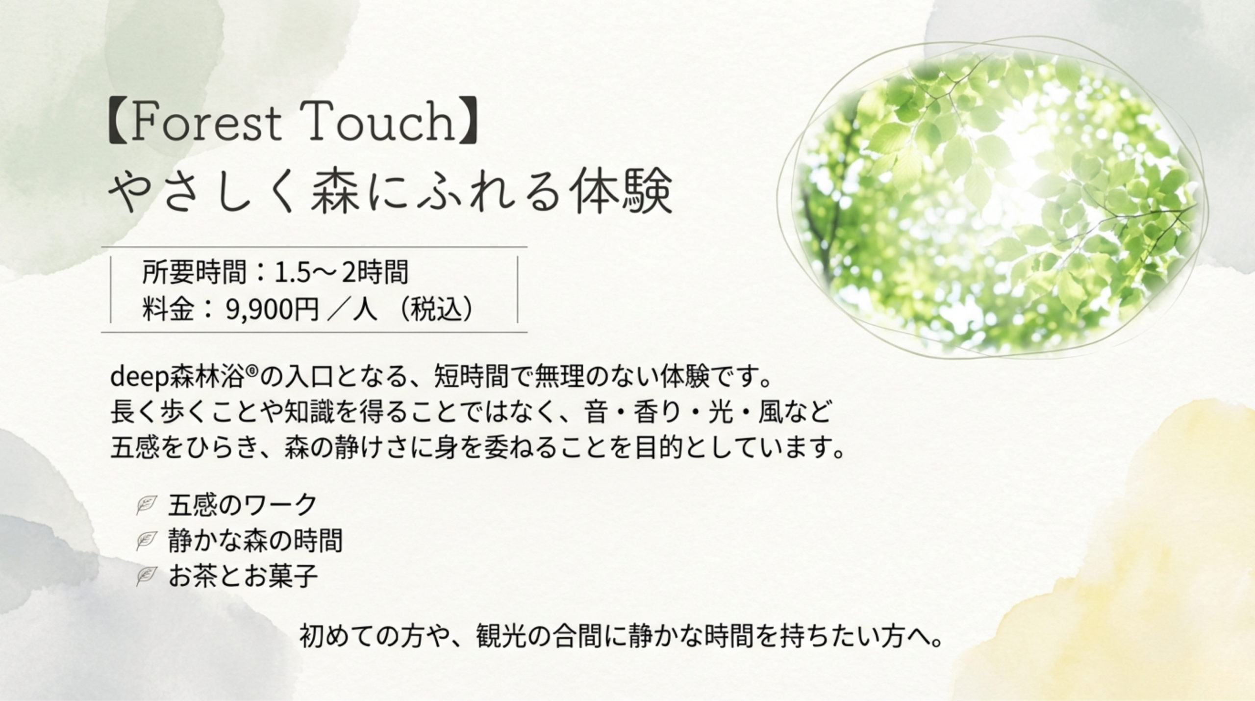 特徴: 観光の合間に静かな時間を持ちたい方や、初めての方に最適な入門プログラムです 。