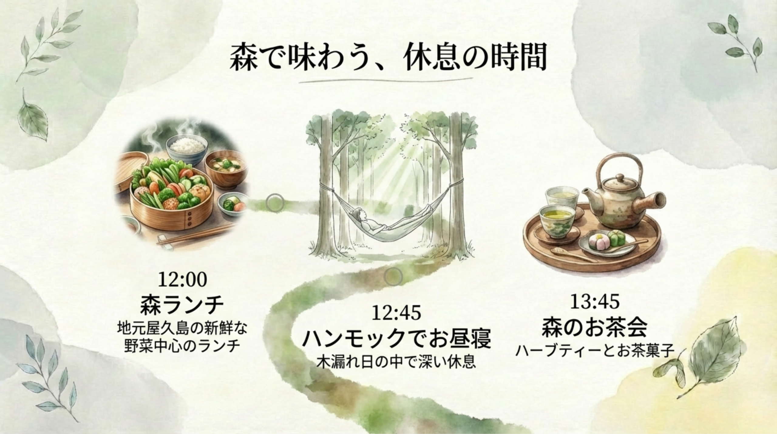 内容: 森のランチ、ハンモックでの休息、アートワークと対話